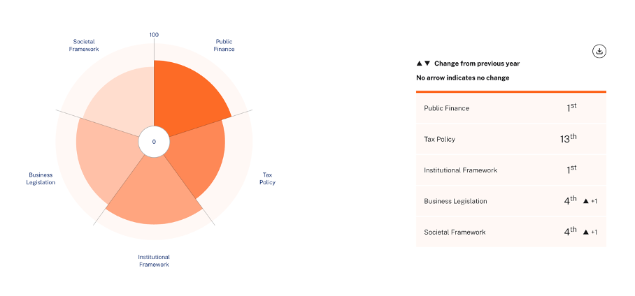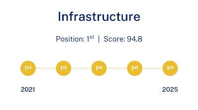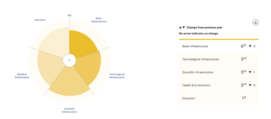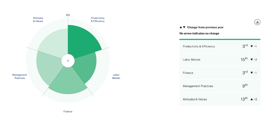 Obwohl die Schweiz in den Kategorien Unternehmenskonkurrenzfähigkeit und makroökonomische Wettbewerbsfähigkeit auf den Rängen sechs beziehungsweise 13 liegt, belegt sie bei Infrastruktur und politischem Umfeld jeweils den ersten Platz. Diese Faktoren waren laut IMD ausschlaggebend für die Spitzenposition.